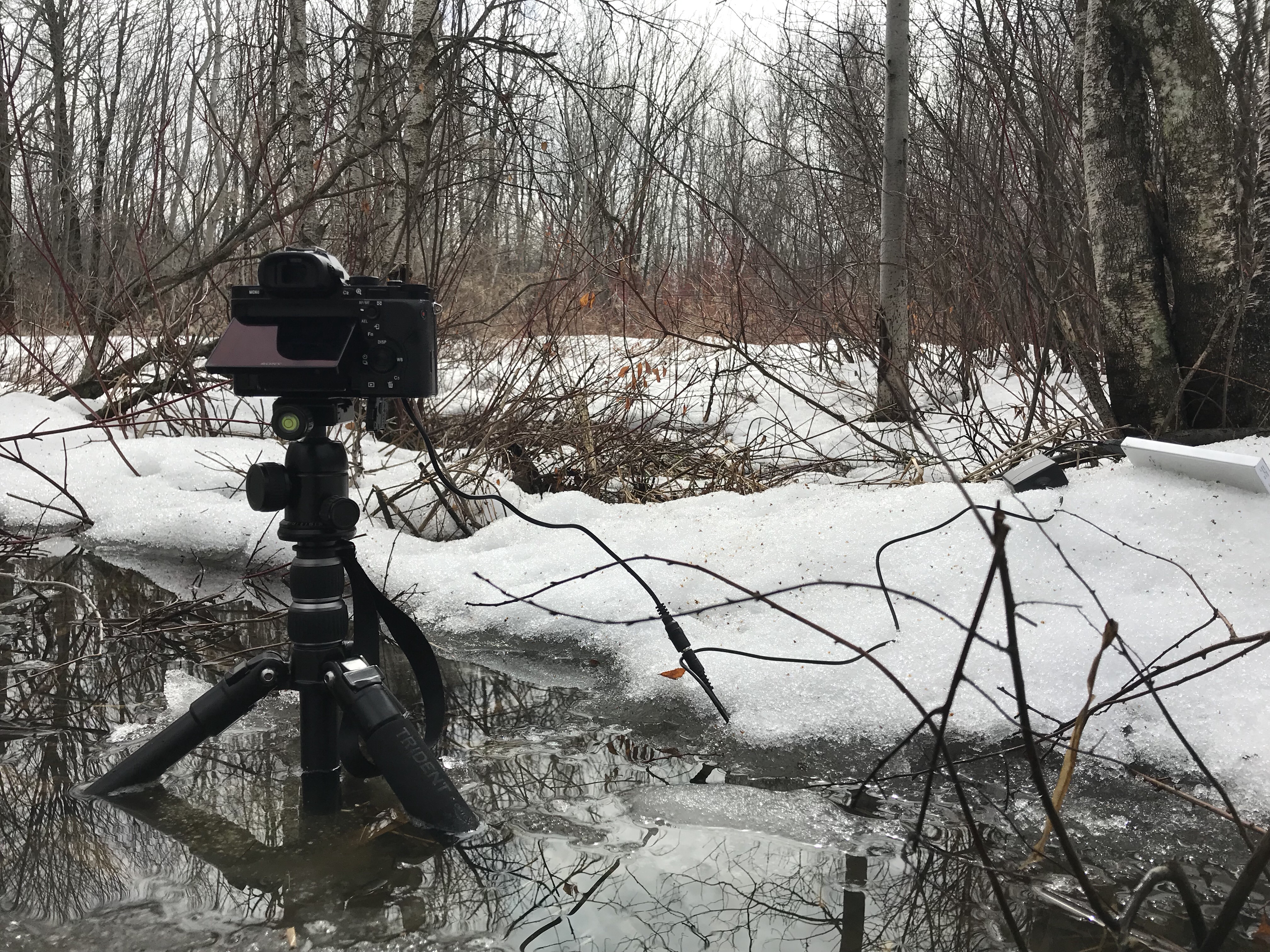 Il y a une Gopro dans l’arbre. Pour un time Lapse. Et traîner l’échelle dans un marais qui fond, ce n’est pas une mince tâche.