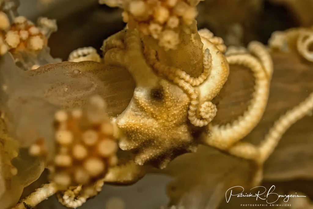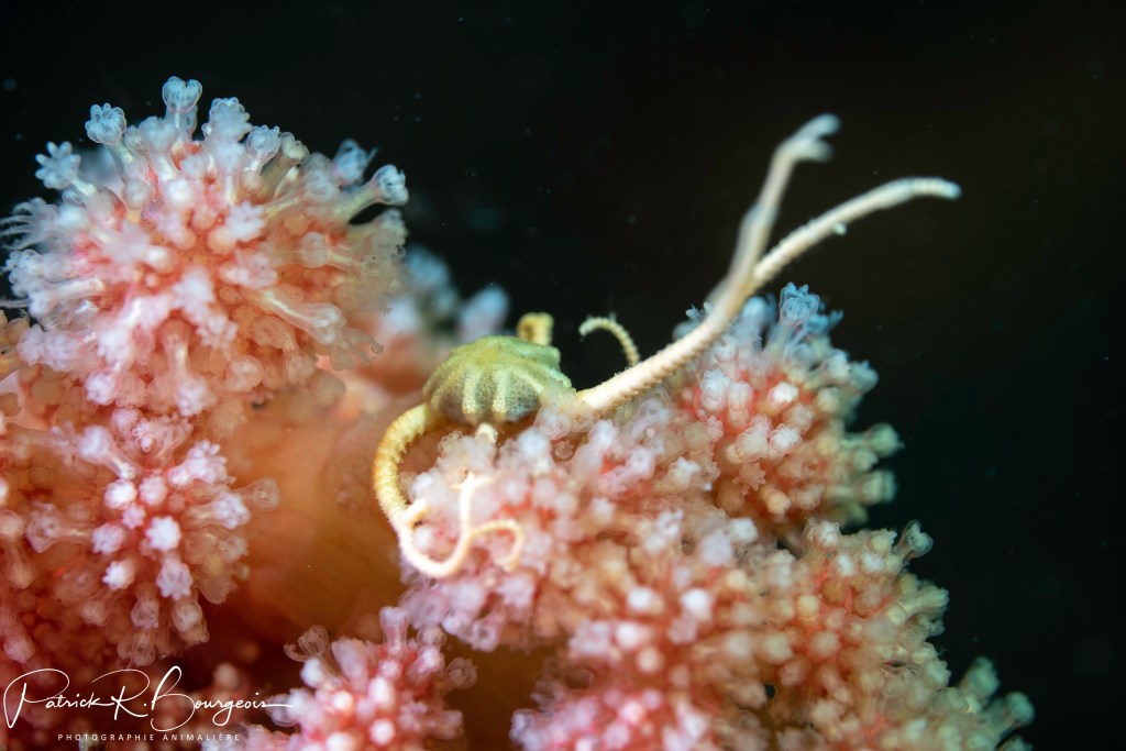 Mais il y a une exception. Mes sites de plongée, près de Baie-Comeau! Il y a quelques sites où j’observe des gorgonocéphales. Mais ce sont toujours des juvéniles. Quelques centimètres en termes de dimension, tout au plus. Et ils sont toujours accrochée à des framboises de mer.