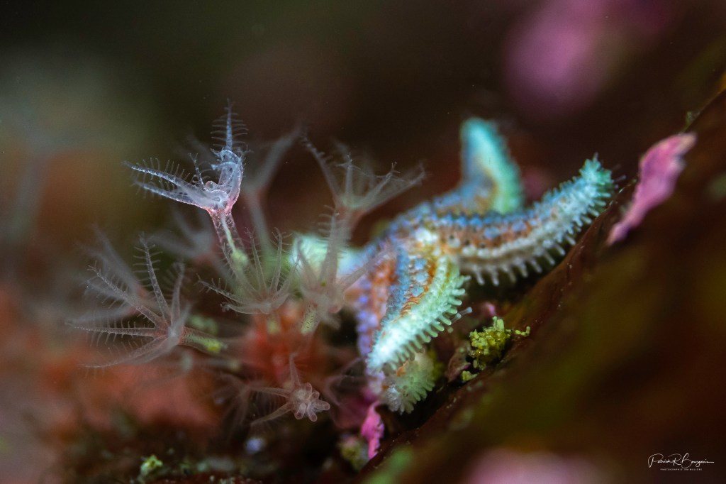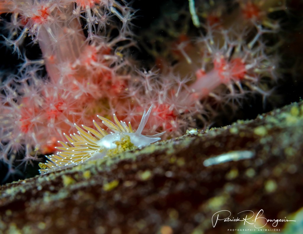 Les nudibranches apprécient particulièrement les framboises de mer. Ils pondent souvent leurs oeufs à côté d’une telle colonie. Pour que la génération suivante puisse s’en nourrir. Les nudibranches parviennent même à récolter le venin des polypes pour leur propre sécurité.