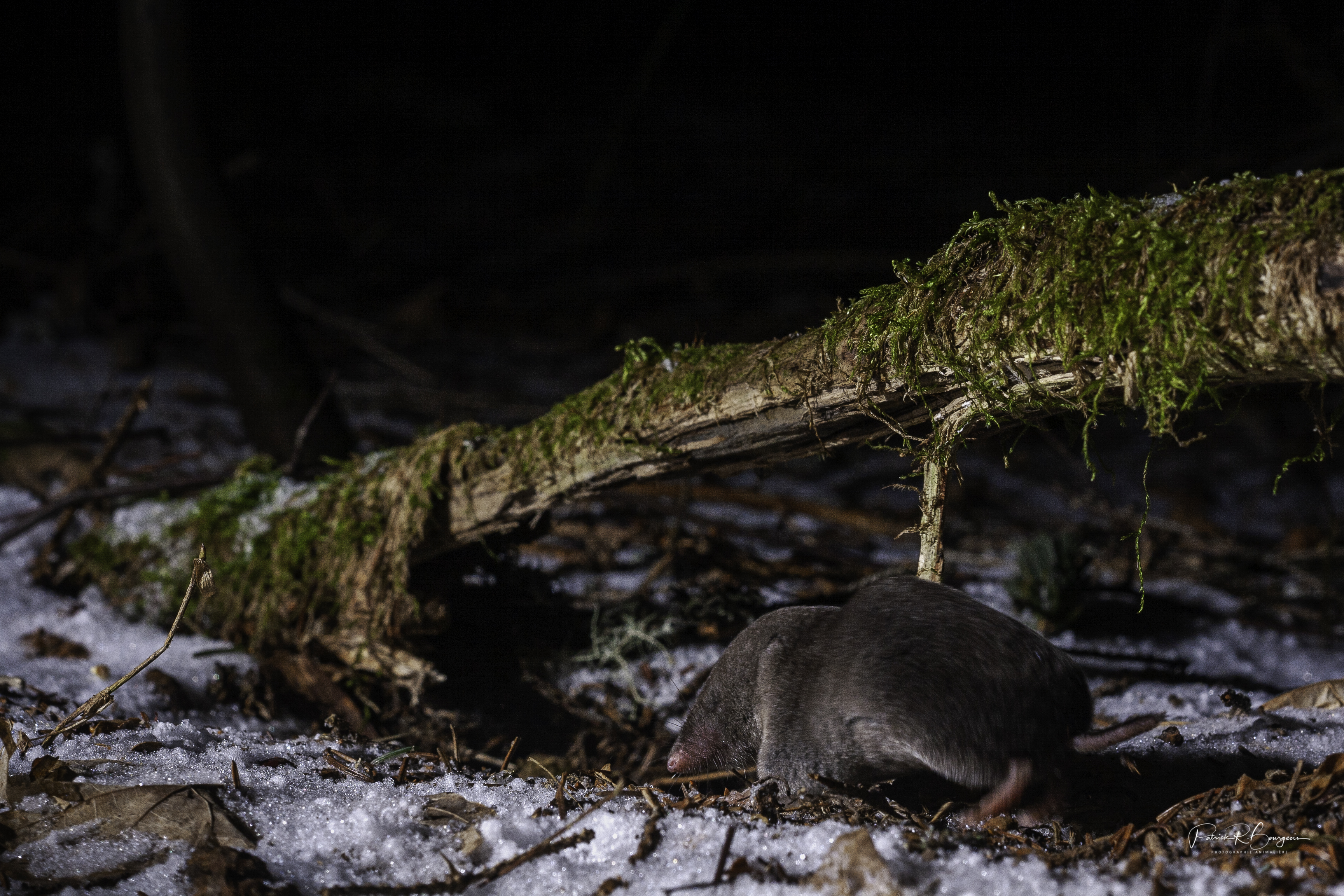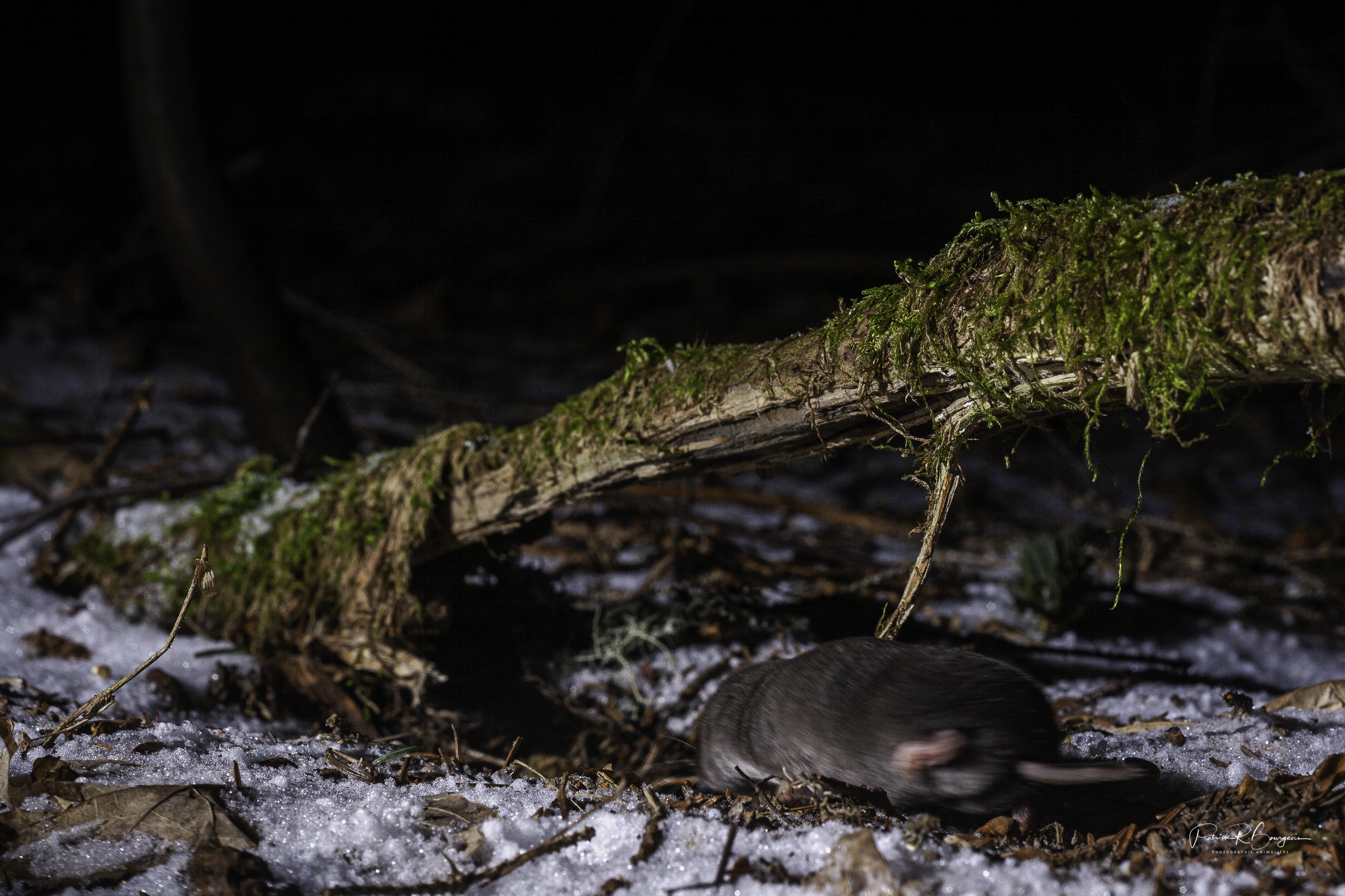i je me fie à mes photos, la musaraigne se déplace toujours en courant. Ça ne laisse que très peu de temps de réaction à mon piège. Celui-ci, lorsqu’un influx lui est envoyé par le détecteur de mouvement/chaleur, doit réveiller les flashs et déclencher ensuite la caméra. C’est rapide, mais ça prend un petit délai quand même. Et ce délai semble suffisant pour que la musaraigne évite de me présenter sa face.