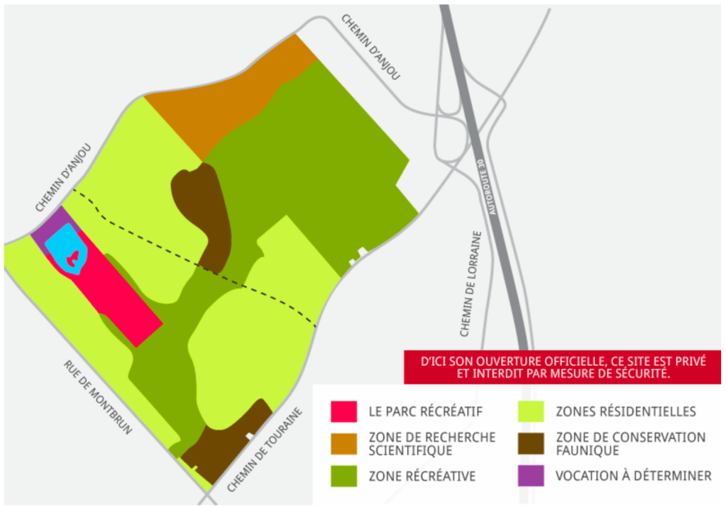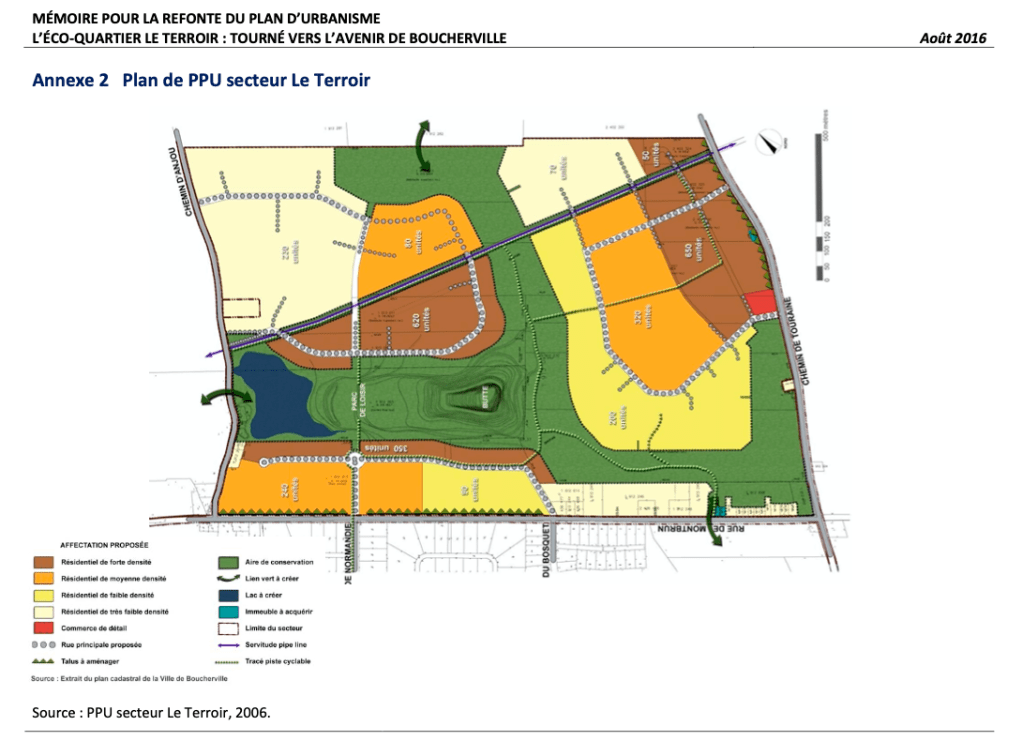 À noter, sur la carte qui suit et qui présente le projet de messieurs Bolduc, Houle et Grilli, que les espaces réservés à la nature ont été réduits comme peau de chagrin. Environ 30% de l’espace total. Cela étant la gracieuseté de certains messieurs oeuvrant de manière pleutre dans les ministères destinés pourtant à protéger la nature. Vers 2007, il y a eu des opérations des Villes forçant l’adoption en série de Programmes particuliers d’urbanisme (PPU) qui permettaient aux promoteurs de développer à peu près n’importe comment, n’importe où, avec l’assentiment du ministère de l’Environnement, à condition qu’ils protègent environ 30% des milieux naturels visés par lesdits projets domiciliaires.