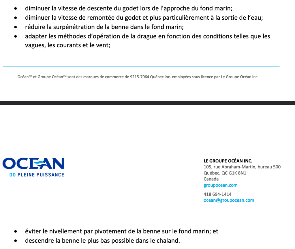Groupe Océan souligne dans la lettre que ce sont là de bonnes mesures, mais que mieux peut être fait. Groupe Océan vante alors ses propres mérites en termes de dragage. De meilleurs godets, de meilleures façons de faire, et une grande expertise en dragage dans le secteur de Contrecoeur, voilà ce que Groupe Océan met de l’avant.