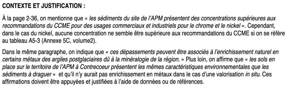 À noter ici que les sédiments qui seraient remués lors du dragage du Saint-Laurent, et ce, pour la construction du nouveau port de Contrecoeur, sont excessivement contaminés, contrairement à ce que prétend Sanexen dans le document remis au ministère de l’Environnement en 2018. Utiliser ces sédiments pour décontaminer un site ne se révélerait pas très pertinent et, jusqu’à preuve du contraire, irait à l’encontre des promesses formulées par Sanexen (sols propres). Il faut savoir que Sanexen a quand même garanti au ministère de l’Environnement en 2018 que 2,3 millions de mètres cubes de sols et de matériaux grossiers propres (béton, briques et roc) seront importés sur le site de la carrière de Boucherville afin de le décontaminer.