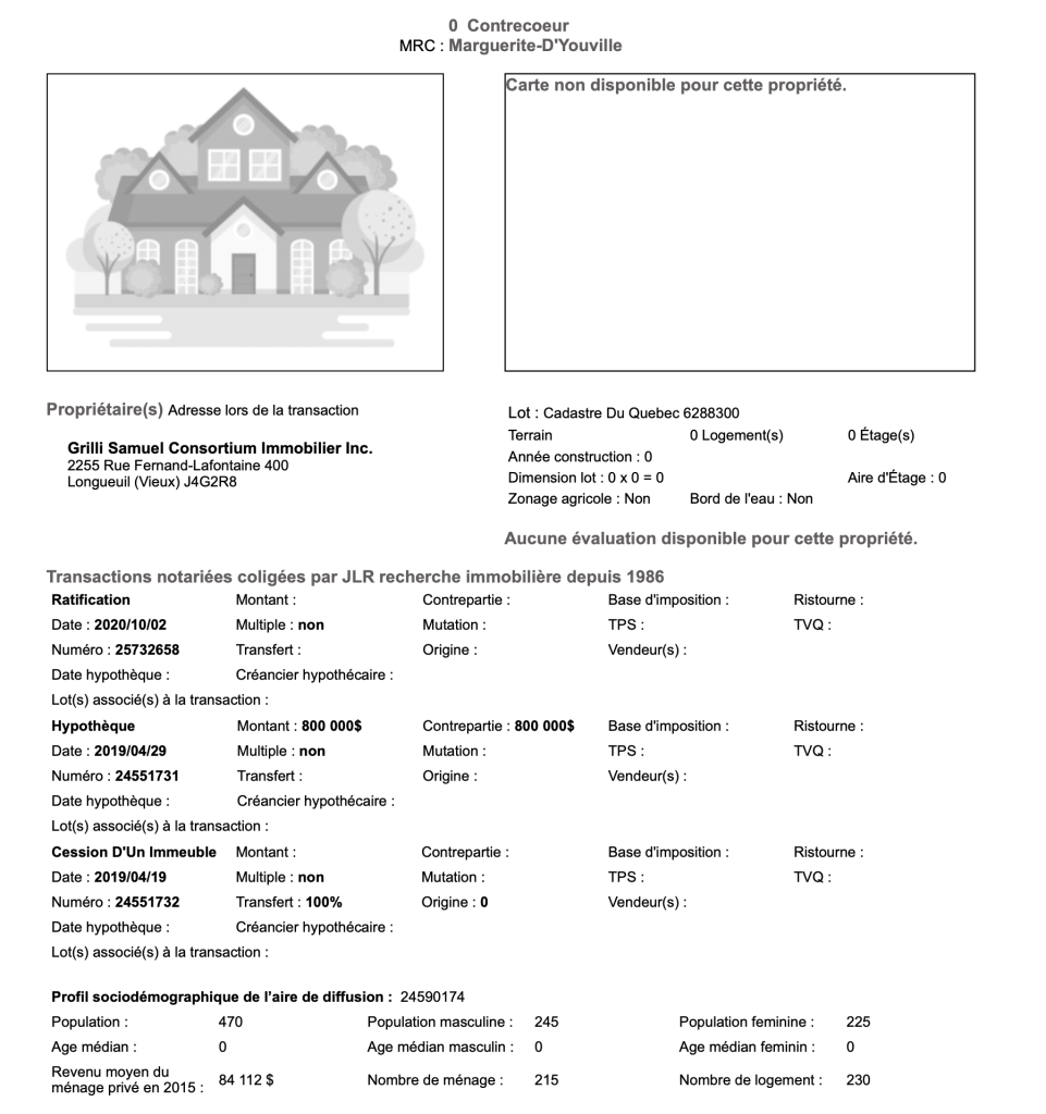 Les lots en rouge de Grilli font partie de la circonscription foncière de Verchères. Les numéros de ces lots sont les suivants: 6 288 299, 6 288 300 et 6 288 301. Il y a eu beaucoup d’action concernant ces lots au cours des derniers mois. Voici des contrats précisant tout cela.