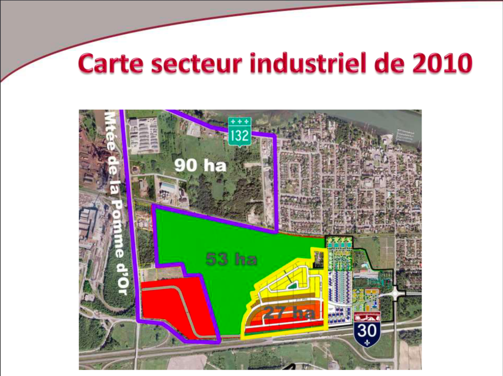 De ce fait, le nouveau Groupe Grilli-FTQ a pu acheter 4,3 millions de pieds carrés de terrain pour leurs projets commerciaux et industriels dans ce secteur. Le montant de la vente? 200 millions$. Les terrains devant servir à leurs projets commerciaux se trouvent, sur la carte ci-bas, à droite de la montée de la pomme d’or.