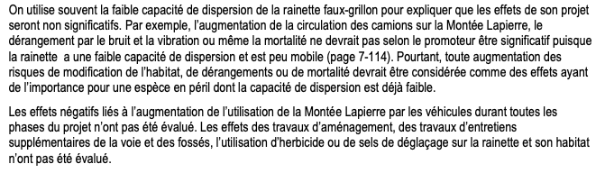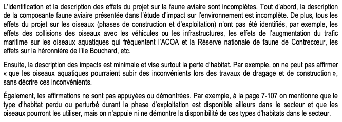 Surtout que quelques années auparavant, Environnement et Changement climatique Canada avait émis plusieurs critiques sévères à l’égard des impacts environnementaux reliés à ce projet. Dans ce rapport, on pouvait lire des formules du genre: