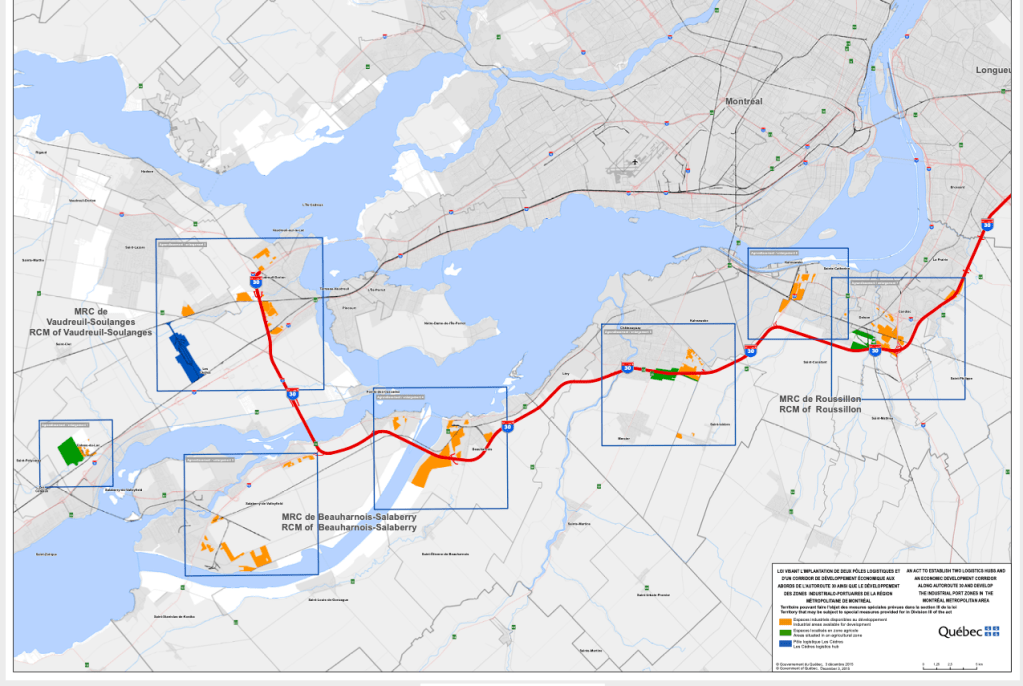 Pour bien relier les deux pôles, le projet de loi 85 fut présenté. Il permettait le développement industriel et commercial tout le long de l’autoroute 30 entre Contrecoeur et Les Cèdres. Pour facilier les choses, le gouvernement Couillard voulait imposer des assouplissements aux règles protégeant le territoire. Voici comment la chose était présentée: