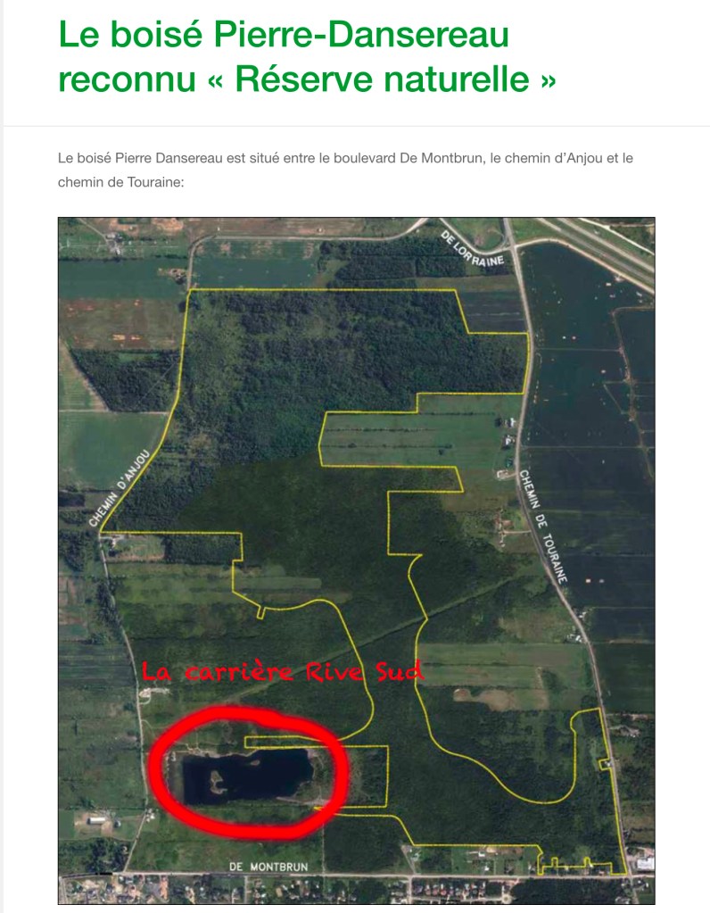 Pour ce qui est de la carrière Landreville (maintenant la carrière Rive-Sud), mentionnons que des années durant, il s’agissait d’un vaste dépotoir illégal en périphérie de Montréal. On y brûlait, en toute violation des lois et sans que les propriétaires ne soient le moindrement du monde inquiétés pour ça, toutes sortes de déchets. (Pour plus de détails, je vous propose la lecture de cet article.)