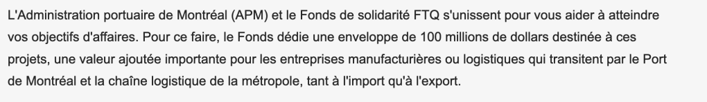 L’une des questions qui fut posée à M. Wilhelmy dans le cadre de cette entrevue avait pour but de l’amener à expliquer le soutien de la FTQ envers la stratégie maritime du Québec et des compagnies qui l’animent. C’est alors que M. Wilhelmy souligne que la FTQ a acheté en 2015, en partenariat avec Axium infrastucture, l’opérateur Montreal Gateway. Ce qu’on savait déjà. Mais là où ça devient particulièrement intéressant, c’est quand M. Wilhelmy explique que la FTQ a aussi financé, dans un second temps, le compétiteur de Montreal Gateway, c’est-à-dire la compagnie Logistec de Madeleine Paquin.