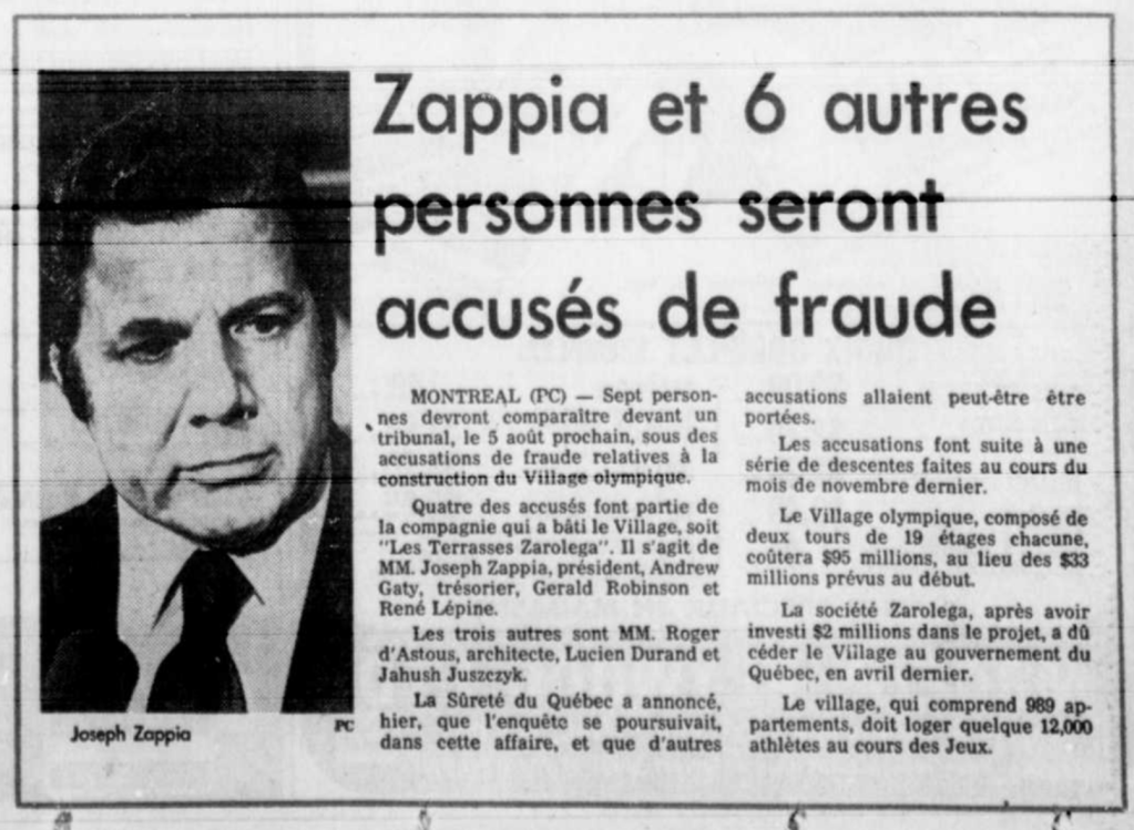 En 1974, René G. Lépine, Joseph Zappia, Gerald Robinson et Andrew Gaty, actionnaires de la compagnie Zarolega, ont été directement nommés par le maire Jean Drapeau pour construire le village olympique des Jeux d’été de 1976. Importante mission s’il en fut une. Mais les problèmes survinrent rapidement et de nombreuses histoires peu ragoûtantes ont circulé à propos de la construction du parc olympique. Les coûts ont d’ailleurs explosé et Joseph Zappia et ses acolytes furent accusés de fraude; la perte de confiance dans les promoteurs était telle que le gouvernement leur retira la propriété du village. L’affaire se rendit devant la Cour suprême du Canada.