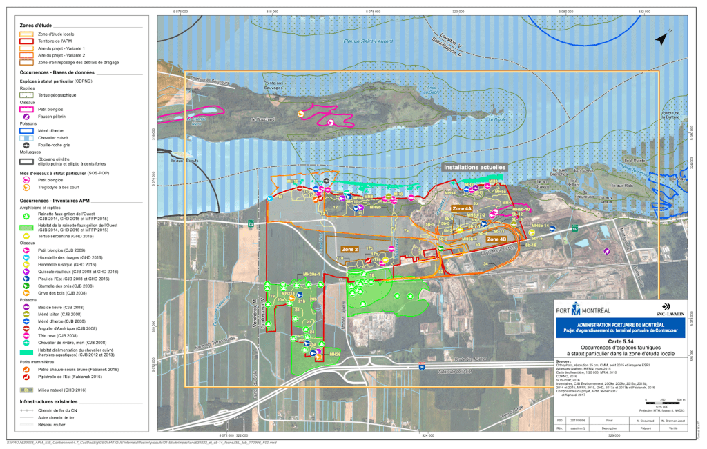 Commençons tout d’abord par présenter le projet de port de Contrecoeur, ce projet pharaonique qui doit être implanté à bout de brousse, soit à 40 km du port de Montréal. Il s’agit d’un projet piloté par l’agence fédérale qu’est l’Administration portuaire de Montréal (APM). Pour la première phase (car il y a plusieurs phases de développement rattachées à ce projet), on parle d’un terminal portuaire faisant transiter quelque 1,15 million de conteneurs par an. Pour ce faire, un quai de 675 mètres serait construit en plein coeur de l’habitat du très menacé chevalier cuivré. Ce quai pourrait accueillir des navires immenses. Dans le jargon technique, on dit que ces navires seraient de 39 000 à 75 400 tonnes de port en lourd (TPL).