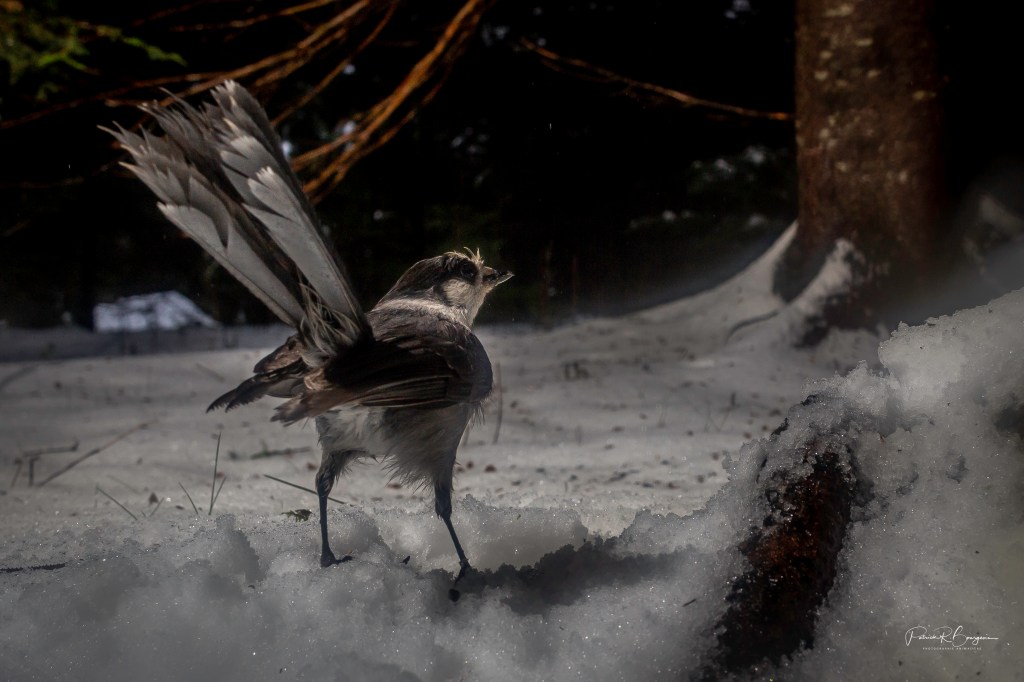 Mais j’ai au moins celle-ci qui me plaît bien. J’aime la posture de ce mésangeai, et son toupet tout mouillé.