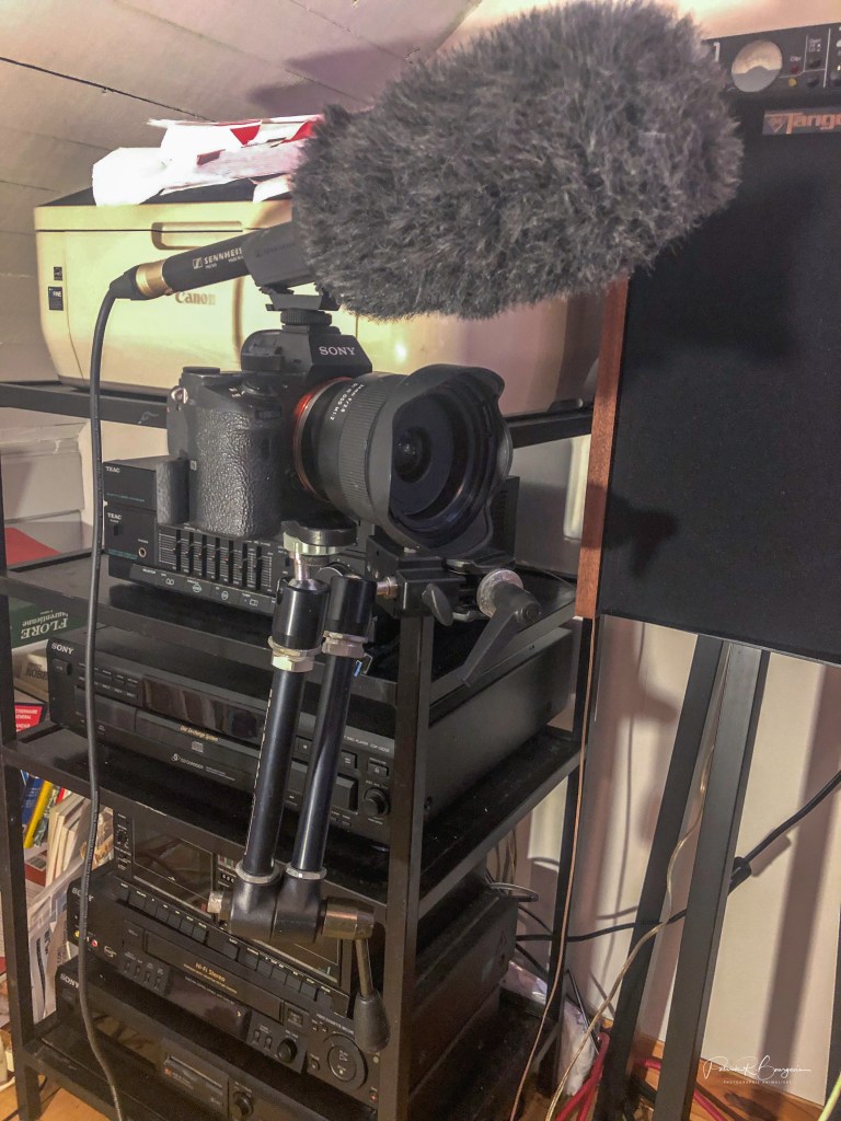 J’ai tout d’abord placé un bras supportant la caméra sur un meuble jouxtant mon bureau. Tourner me prendra de ce fait quelques instants seulement puisque tout sera déjà en place.
