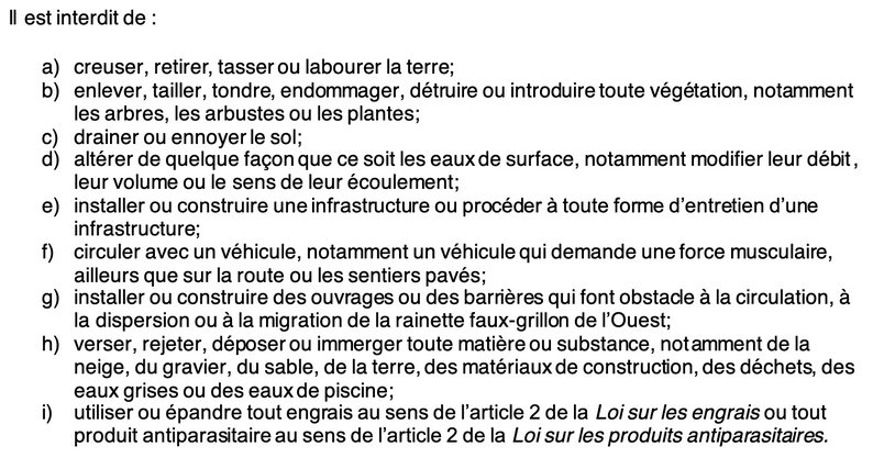 Le positif, c’est que les promoteurs Shathony ne pourront plus rien faire sur leur terrain afin d’endommager l’habitat de la rainette. Voici ce que le décret interdit à partir de maintenant: