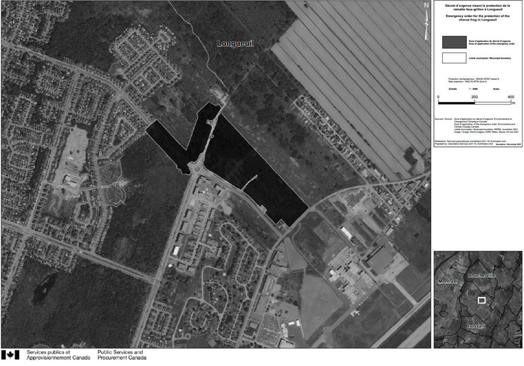 Pourquoi je dis que ce n’est pas assez? Parce que la zone qui devient ainsi protégée est très petite (zones en noir sur la carte ci-bas). Elle ne concerne que les terrains des promoteurs Borsellino et Shathony, de même que le tronçon où la Ville de Longueuil rallongeait le boulevard Béliveau depuis des semaines maintenant, et ce, en plein coeur d’un habitat sensible de la rainette faux-grillon.