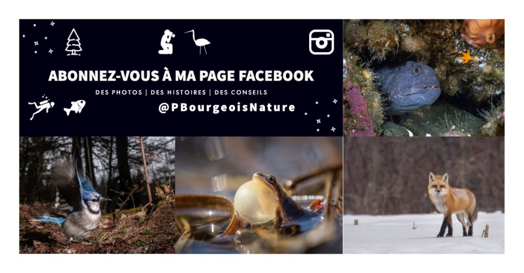 Via ma page, je partage des images impressionnantes des animaux du Québec, je vous raconte des histoires étonnantes, et vous donne des conseils en photo nature.