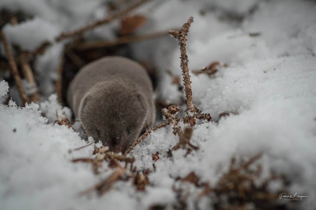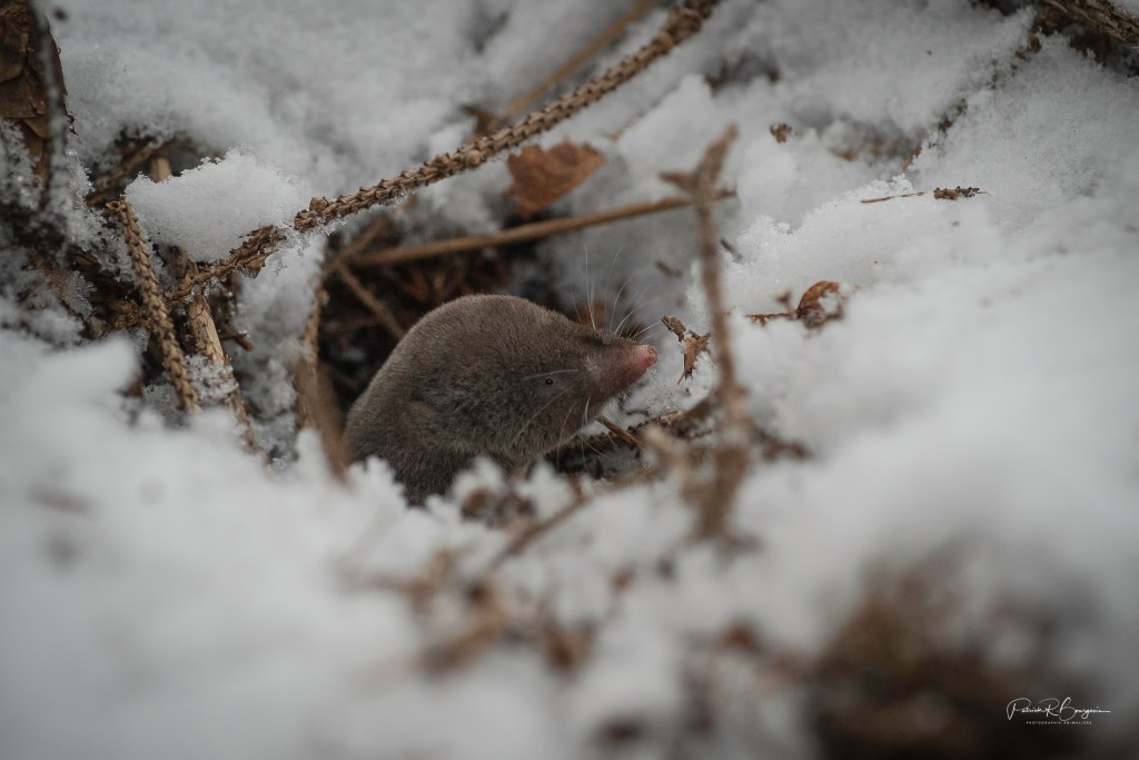 Pour photographier la musaraigne, je me suis installé le plus simplement du monde. Bien assis dans la neige, sans remuer d’un poil, attendant qu’elle daigne sortir de son repaire pour que je la pose.
