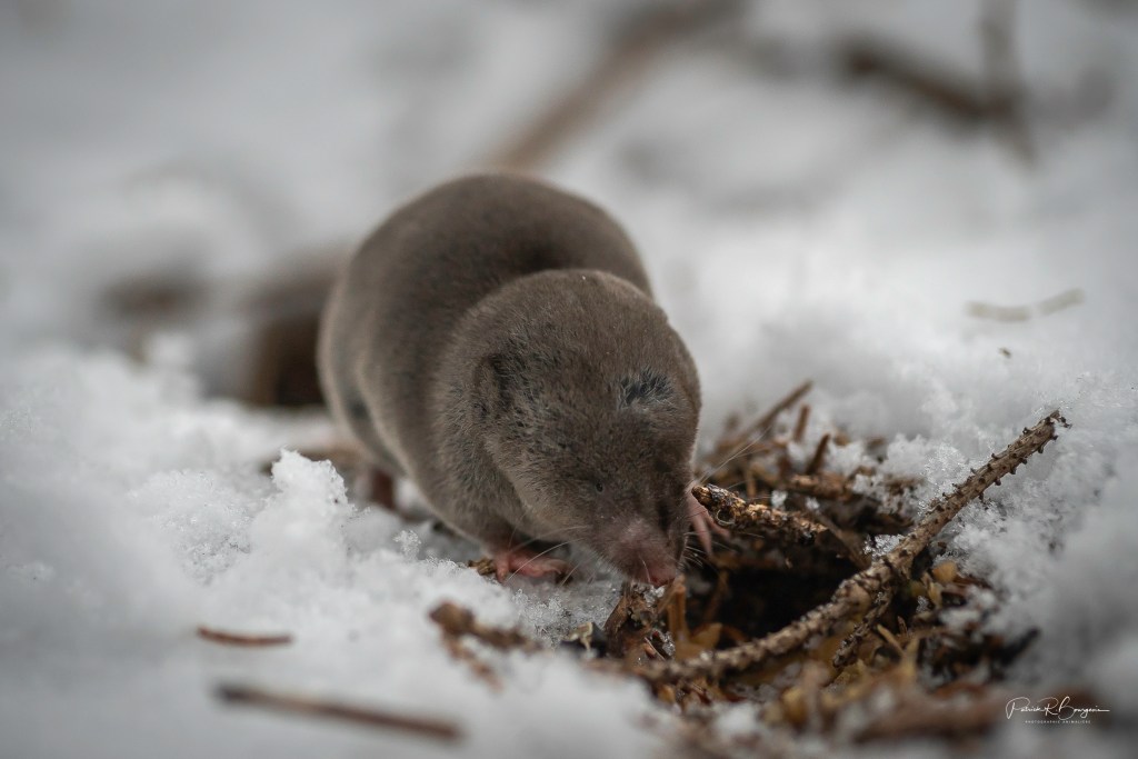 Il ne faisait hier pas très froid. Autour du point de congélation. Mais quand on reste assis immobile, c’est assez pour avoir froid rapidement. Heureusement, la musaraigne n’a pas mis de temps avant de s’activer. J’ai pu la photographier plusieurs fois.