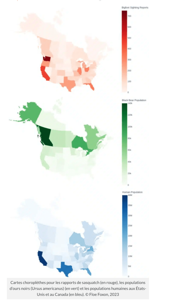 La méthode employée par Foxon est simplissime. Il a divisé l’Amérique du Nord en grandes régions. Il a par la suite produit des cartes afin de présenter les régions où on retrouve le plus grand nombre d’observations de bigfoot, là où il y a les plus fortes densités humaines et, finalement, là où on trouve le plus d’ours noirs. Il a par la suite croisé le tout.