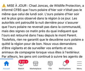 Un deuxième ours polaire a été aperçu dans le village. Et il s’agit du plus gros qu’ils n’ont jamais vu dans la région. La radio du village (CFBS) a d’ailleurs émis un communiqué à ce sujet: