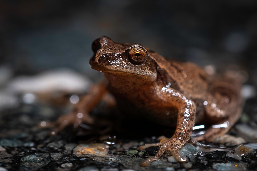 Partir la nuit, à la rencontre d’un animal qui est tout juste un peu plus gros qu’une rainette faux-grillon, c’est-à-dire qu’il est minuscule lui aussi, cela relève toujours d’une aventure palpitante. Pour ce faire, j’enfile des bottes-pantalon. Lorsque je photographie des amphibiens, j’aime placer ma caméra à leur hauteur le plus possible. Et pour y parvenir, rien de tel que de s’accroupir dans l’eau, dans la vase.