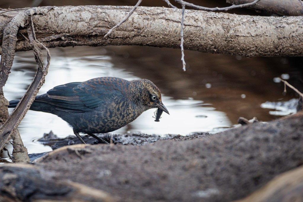 Sur cette photo, on aperçoit un quiscale rouilleux. Ces oiseaux marchaient dans la vase tout autour de l’étang qui se trouvait devant moi. Ils cherchaient les larves qui évoluaient dans l’eau. D’un coup de bec rapide, ils s’en saisissaient et les avalaient.